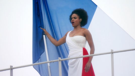 グラン パレの屋上で「ラ マルセイエーズ」を披露したアクセル・サン=シレルは、8メートルを超える見事なドレスを身に纏いました。ディオールの特徴であるドレープ技術を駆使し、ドレスが旗として始まり、旗がドレスになるという限りない妙技がそこに体現されています。アレクサンドル3世広場では、約60人の女性合唱隊が、歌声を響かせながら、マリア・グラツィア・キウリによって再考されたペプラムを纏います。この作品は、フェミニズム運動の歴史的人物であり、4月に他界する前はディオールといくつかの特別なイベントでコラボレーションしていたフェイス・リンゴールド(1930-2024)が1971年に考案したもので、”Woman”と”Freedom”、そして最も力強く象徴的なエンブレムである”2024”の文字があしらわれました。