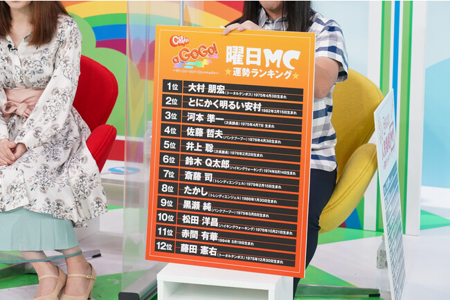 番組発表のほか、スタジオでは、Love Me Doによる「チーキーズ a GO GO!」MC+赤間アナ12名の運勢ランキングを発表。なんと1位は大村、11位に赤間アナ、12位に藤田と明暗をわける結果となりました。