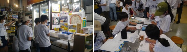 フグの魅力をたくさんの人に知ってもらうため、オリジナルのコラボ食品をみんなで考えてみよう! そのためにはフグを使った商品がどれだけ売られているかを知る必要があります。ということで、唐戸市場内を学びサポーターと一緒に班ごとに回って調査を含めたお買い物をして、できるだけ多くの種類のフグの食品を集め、ヒントに繋げます。から揚げ、握り寿司、干物などの種類の中から、参考になりそうな商品をみんなで相談しながら真剣に選んでいきます。買い物の後は、隊員たちが選んだ商品を実際に試食し、分析シートに記入していきました。味や形、パッケージなど、食べ比べて分析するのは難しいですが、 学びサポーターのリードで、コラボ食品のアイディアも出し合っていきました。