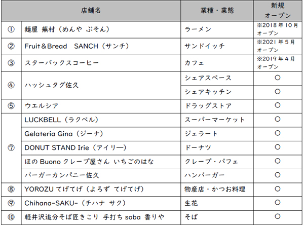 ※「フレスポ佐久インター」の麺屋蕪村は2018年10月、スターバックスコーヒーは2019年4月、SANCHは2021年5月にオープンしています。
