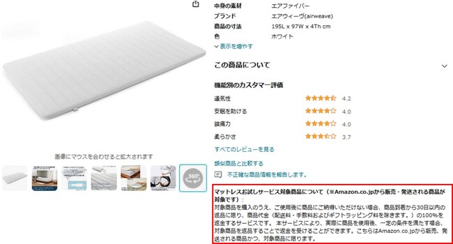 Amazonは、お客様に安心してマットレスを購入いただけるよう、「マットレスの30日間お試しサービス」を9月1日(金)から開始いたしました。本サービスは、Amazon.co.jp上でご購入の上、ご使用後寝心地などに納得いただけない場合、商品到着から30日以内での返品に限り、商品代金(配送料・手数料およびギフトラッピング料を除く)を全額返金し、返品時の配送料もAmazonが負担いたします。「マットレスの30日間お試しサービス」では、エアウィーヴ、 西川、フランスベッド、ショップジャパン、アイリス、無印良品、マニフレックスなどの人気ブランドを中心に、計150点以上の商品が対象となります。