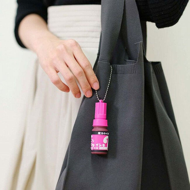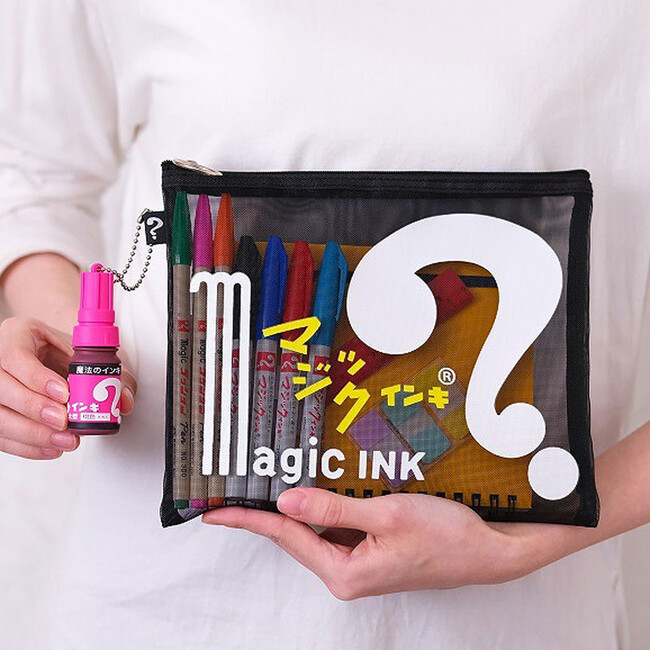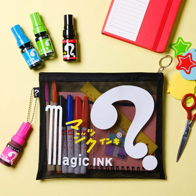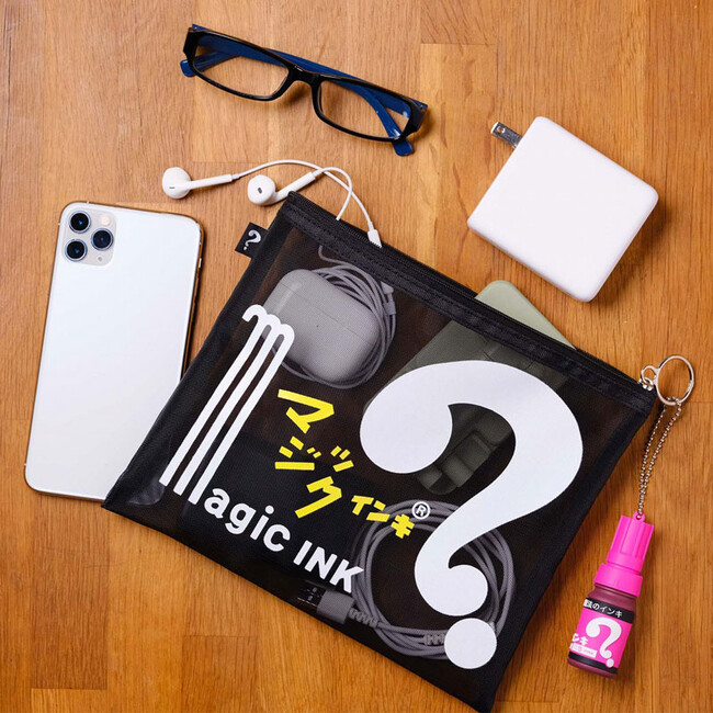 おなじみの「?」マークがレトロかわいい、1953年に誕生した日本初の油性マーキングペンが、かわいいメッシュポーチになりました。中身が見えるフラットなメッシュ素材のポーチと、見た目も重さもリアルな、マジックインキそっくりのかわいいビッグチャームのセットです。文具やガジェット類、趣味の道具など、お気に入りアイテムをチラ見せさせながら持ち運べます。