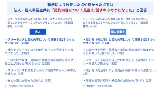 フリーランス新法開始により、改善した点や良かった点については法人・個人事業主ともに「契約内容について見直す/話すキッカケになった」「口頭発注が減った/なくなった」という回答が上位になりました。