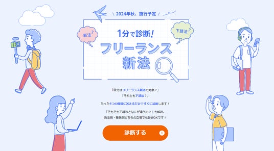 受注者・発注者それぞれどんな対応が必要なのか診断できるサイト「1分で診断!フリーランス新法」も公開中です。本サイトでは、4つの選択式の質問に答えていくだけで、下請法・フリーランス新法の対象か診断します。また、具体的に発生する作業や注意点を解説します。
