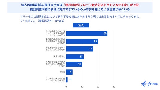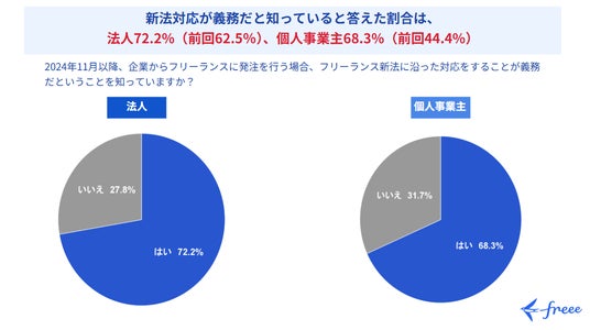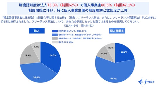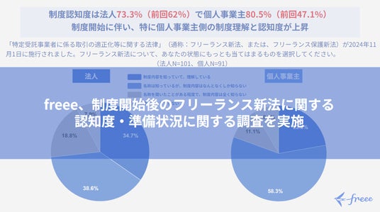フリー株式会社(本社:東京都品川区、CEO:佐々木大輔、以下「freee」)は、11月に開始したフリーランス新法に関して、法人・個人事業主を対象とした「フリーランス新法に関する認知度・準備状況に関する調査」を実施しました。新法施行前の昨年9月にも同様の調査を行っており、新法施行前後での変化を調査しています。