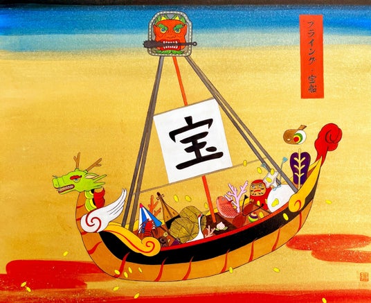 齋藤 理絵 「フライング・宝船」 F8号 日本画 和紙、岩絵具、水干、墨