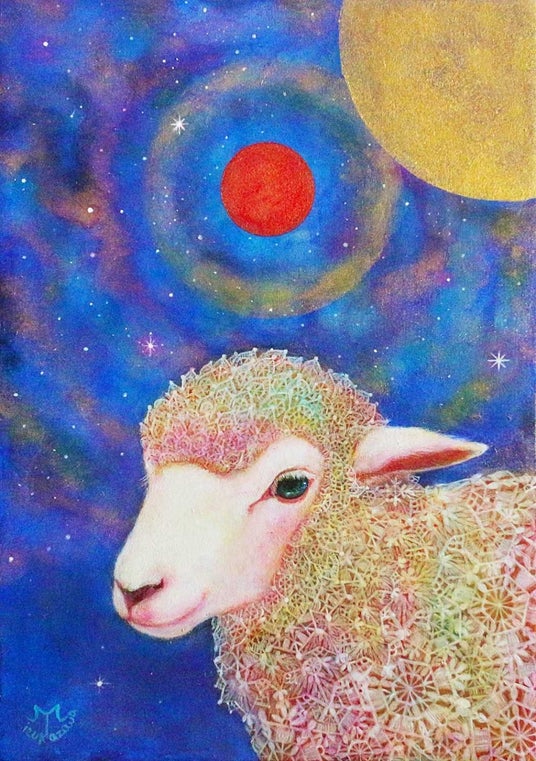 水城 月葉 「羊飼いに導かれ(II)」 21×14.8cm アクリル画 紙、アクリル絵具、顔料