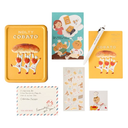 大阪のコッペパン専門店「コバトパン工場」と手帳やノートを主に展開する「NOLTY」がコラボレーション。人気の「コバト缶」に、ノートやボールペンなど計5アイテムを詰め合わせた文具セットが登場。缶はNOLTYのロゴが入った限定デザイン。