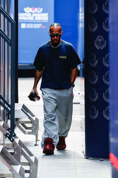 ルイス・ハミルトンは、自身がゲストデザイナーを務める 2025年スプリング ライフスタイルカプセルコレクションよりブラックのコットンジャージーTシャツに、ライトグレーのコットンラージパンツを纏い、シルバーブラスとマルチカラークリスタルがあしらわれたネックレス、そしてワインレッドのマイクロファイバーとメッシュのスノーダービーを合わせました。