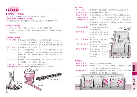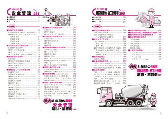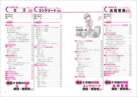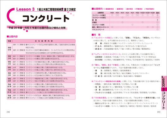 内容を分野別(土工、コンクリート、品質管理、安全管理、建設副産物・施工計画等)に構成し、レッスン冒頭の「チェックポイント」は豊富なイラストや図表を取り入れ、丁寧にわかりやすく解説しました。