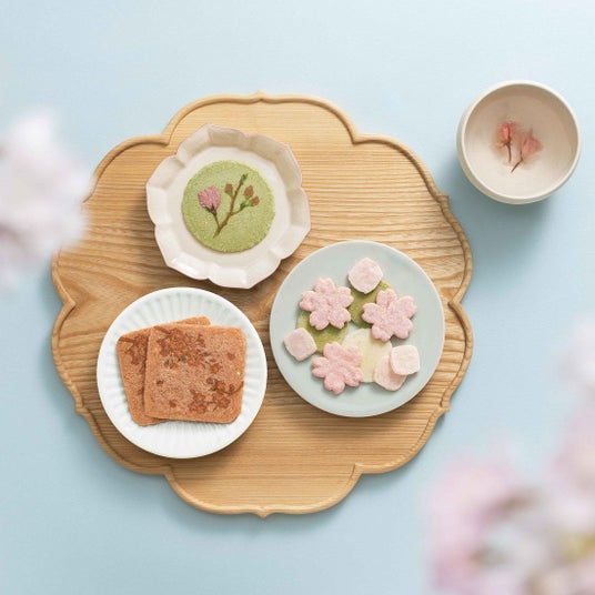 奈良県の「大和茶」を使用したえびせんべいに桜花を添えた春の萌し、軽やかな食感の桜葉風味のえびせんべいなど、桜の香りがひろがる春を感じるえびせんべいです。
