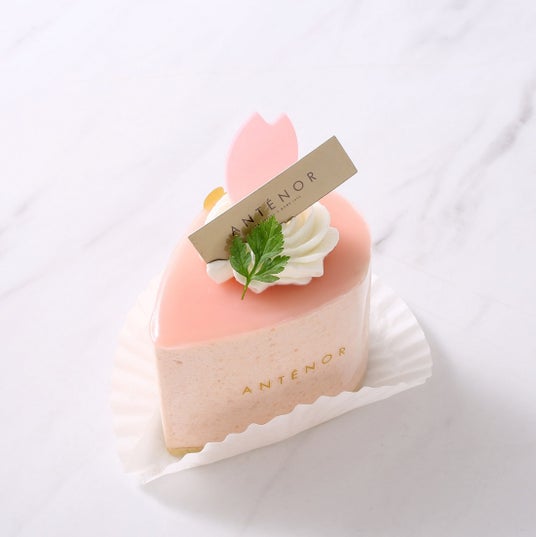 桜の花びらをイメージした春の新作ケーキ。桜が香るグラサージュで爽やかな桃のムース、すっきりとした甘みの桃の果肉入り桜のソース、紅茶のクリームブリュレを包みました。