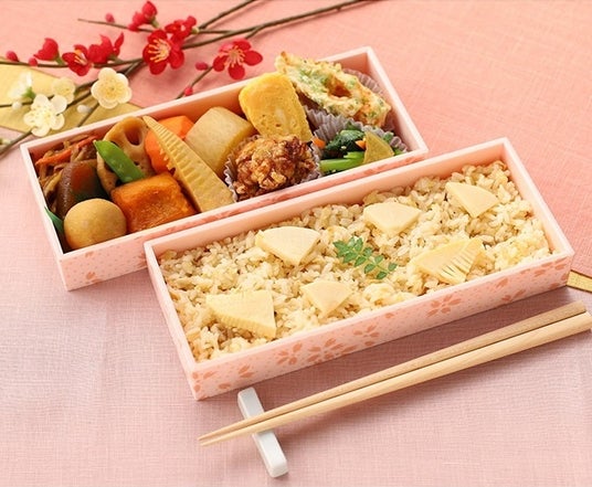 桜の花と山せりをトッピングした筍ごはんと、ふきや菜の花など春を感じるお弁当です。