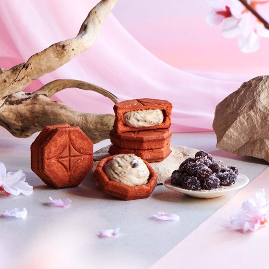 桜パウダーと桜ピューレを加えたクッキー生地に、ほのかな塩味を感じる桜の葉と大納言あずきを使った甘納豆を合わせた、桜もち風味のバタークリームをサンドしました。
