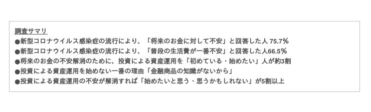 調査の結果、新型コロナウイルス感染症の流行から、将来のお金に対して不安と回答した人が7割を超え、不安解消のため投資による資産運用も視野に入れている人が多いという実態がみえてきました。