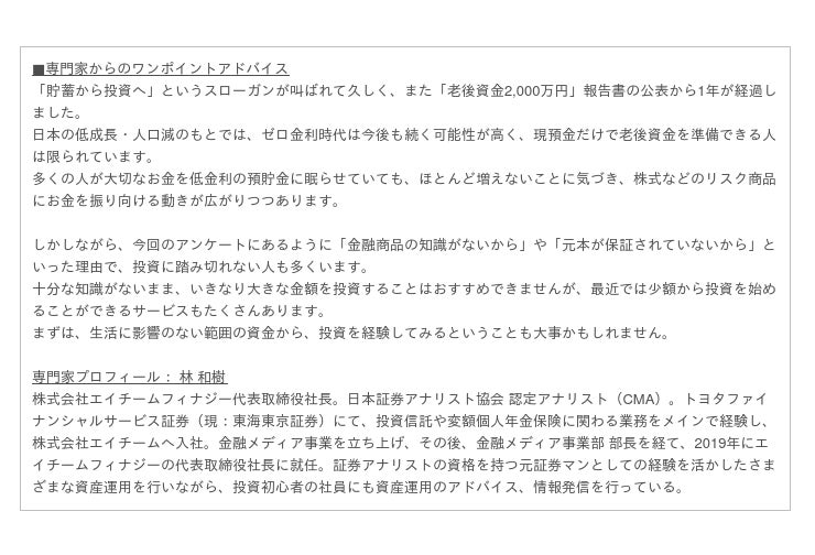 Q2では、新型コロナウイルスによるお金の不安は、直接的な「普段の生活費」が一番多く、次に「充分な収入が得られなくなること」、「老後の生活資金」がそれぞれ5割以上でした。その結果本設問では、「節約」や「預貯金」など手軽にできることから始めたいor始めている人が、それぞれ約5割と多くなったと考えられます。また、将来のお金の不安解消のために、投資による資産運用を始めたいor始めている人は約3割。収入の減少や老後の生活資金といった将来の不安に対して「資産運用」で解消したいと思っている人も多くいると推察されます。