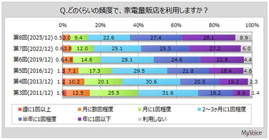 マイボイスコム株式会社(東京都千代田区、代表取締役社長:高井和久)は、8回目となる『家電量販店の利用』に関するインターネット調査を2025年12月1日~7日に実施しました。