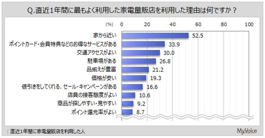 直近1年間に家電量販店を利用した人に、最もよく利用した量販店の利用理由を聞きました(複数回答)。「家から近い」が52.5%、「ポイントカード・会員特典などのお得なサービスがある」が33.9%、「交通アクセスがよい」が30.0%です。