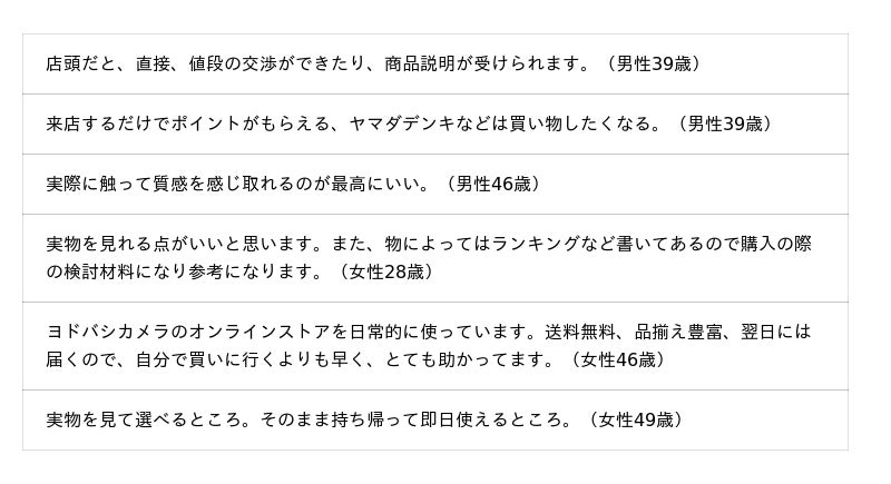 最もよく『ビックカメラ』を利用した人、または『ヨドバシカメラ』を利用した人では、「交通アクセス」「ポイントカードなどのお得なサービス」「品揃え」が上位3項目です(順不同)。