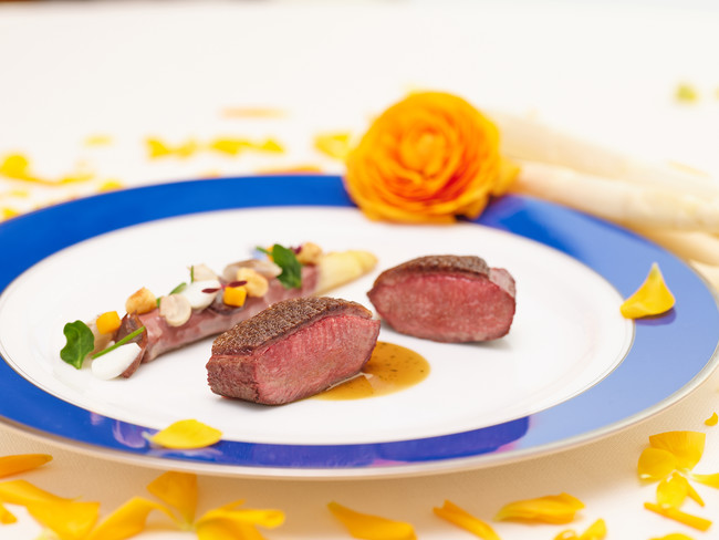 スペシャリテの幼鴨のローストに、みずみずしいホワイトアスパラガスと芳醇な赤ワインソースを合わせた春らしい逸品。ヴィニュロン風にスッキリとした味わいに仕上げたシャトーブリアンソースでお愉しみください。