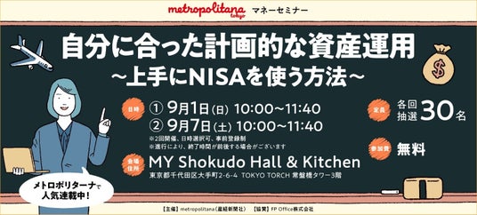 メトロポリターナ(産経新聞社発行)は、マネーセミナー「自分に合った計画的な資産運用~上手にNISAを使う方法~」を東京都千代田区のカフェラウンジ「MY Shokudo Hall & Kitchen」で9月1日(日)午前10時、7日(土)午前10時からそれぞれ開催し、参加者を募集します。