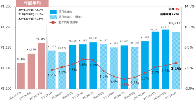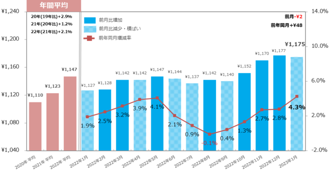 23年1月の全国平均時給は1,175円で、前年同月比は5カ月連続で増加するも、前月比では4カ月ぶりに微減【図1】