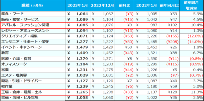 職種(大分類)別では、[工場・倉庫・建築・土木]が1,265円(前月比:-33円、前年同月比:+128円)、[アパレル・ファッション関連]が1,085円(前月比:+9円、前年同月比:+102円)で、前年同月比100円以上の増加。また、[工場・倉庫・建築・土木]の求人件数は前年同月比で約1.6倍に増加した。
