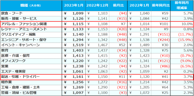 職種(大分類)別では、[アパレル・ファッション関連]が1,115円(前月比:+7円、前年同月比:+101円)、[配送・引越・ドライバー]が1,161円(前月比:+11円、前年同月比:+41円)と、2職種で前月比・前年同月比ともに増加した。また、前年同月比で求人件数が最も増加したのは[工場・倉庫・建築・土木]で1.9倍増となった。