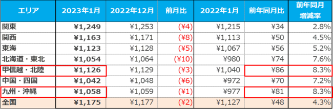 「甲信越・北陸」では1,126円(前月比:-3円、前年同月比:+86円)、「九州・沖縄」では1,058円(前月比:-1円、前年同月比:+81円)となり、前年同月比で80円以上の増加。