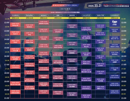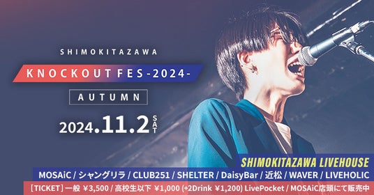 「KNOCKOUT FES 2024 autumn」は、今の時代を生きるバンド・アーティストに重きを置いた、下北沢のライブハウスMOSAiCのブッキングイベントを拡張したサーキットフェスです。今回は、MOSAiCの他、シャングリラ、CLUB251、SHELTER、DaisyBar、近松、WAVER、LIVEHOLICを会場とし、全国のライブハウスを拠点に活動するアーティストたちが下北沢に集結します。
