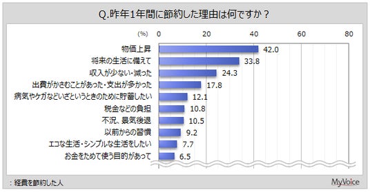昨年1年間に経費を節約した人が、節約した理由は(複数回答)、「物価上昇」が42.0%、「将来の生活に備えて」が33.8%、「収入が少ない・減った」が24.3%です。