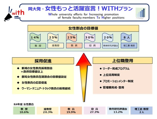 本事業では、「岡大発・女性もっと活躍宣言!WITHプラン」をコンセプトに、新たに「岡山大学版リーダー育成プログラム」を実施し、女性上位職・管理職候補者を育成するとともに、准教授以上の上位職女性教員の増員ならびに女性教員割合の増加を図ります。