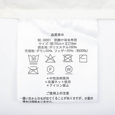 充填物:ダックダウン50%、フェザー50%(約0.3kg)