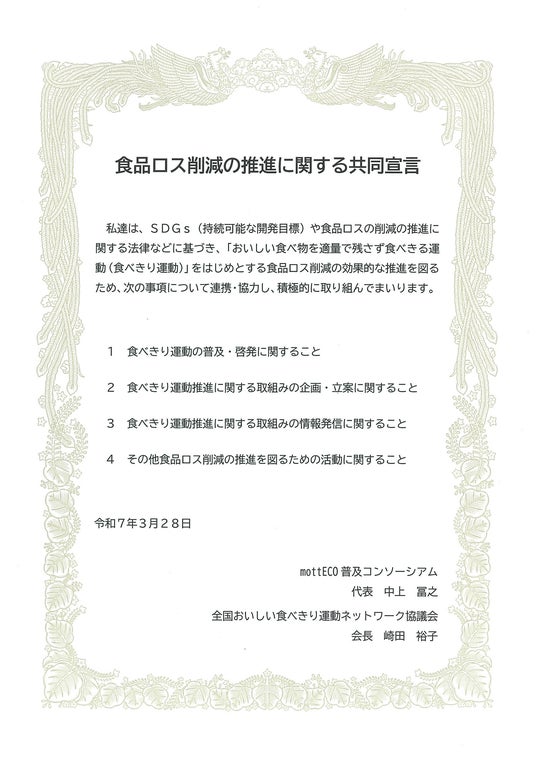 「mottECO普及コンソーシアムと全国おいしい食べきり運動ネットワーク協議会は、SDGsや食品ロス削減の推進に関する法律などに基づき、「おいしい食べ物を適量で残さず食べきる運動」をはじめ、食品ロス削減の推進を図るため、連携・協力し、積極的に取り組む」
