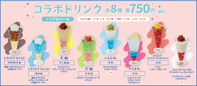 コラボドリンクには、楽曲をイメージした「START DASH【初回限定盤】」「START DASH【通常盤】」「犬猫【犬と猫盤】」「犬猫【彩香盤】」「ハイライト【復刻】」「ダイスキ。【復刻】」「NOISY LOVE POWER☆【復刻】」「Give Me Five!!!!!~Thanks my family~」の8種[各750円(税込)ノンアルコール]をご用意しました。注文特典として、コラボドリンク1品ご注文につき、「大橋彩香」オリジナルコースター全9種の中からランダムで1枚プレゼント!