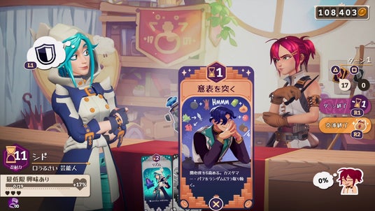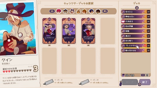 客との交渉はデッキを組んだカードを使用して行われる。「売り口上」や「興味を引く」などで客の関心度を高めていこう。もちろん客も交渉術を駆使してくるので、うまく対応してストレスを溜めないように心がけよう。さらにラフタにいる人々から交渉術を学べることもあるので、交流も忘れずに!