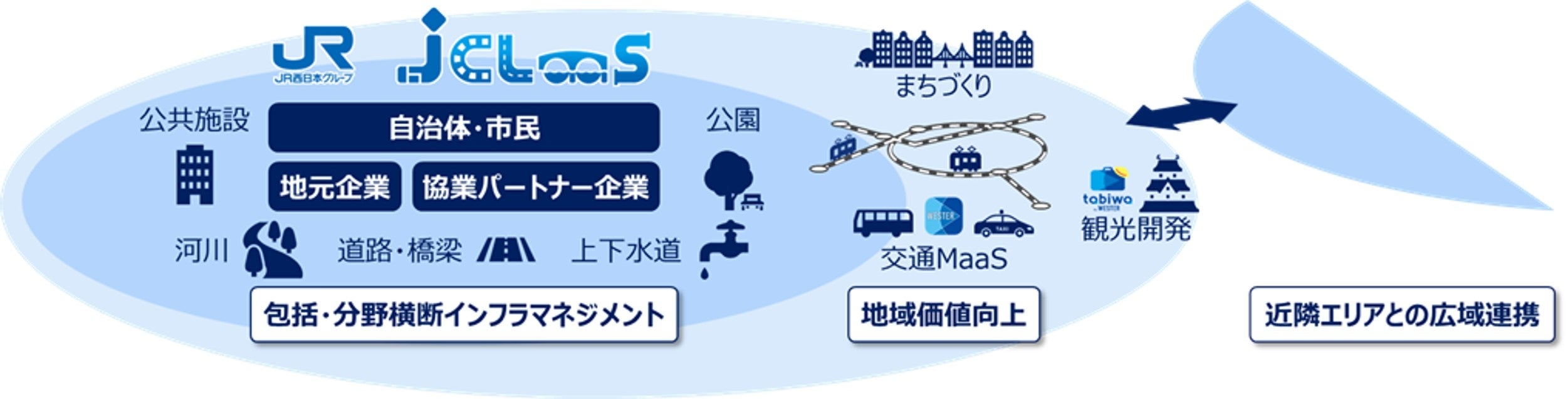 「JCLaaS」は、施設・設備の老朽化、担い手不足、財源不足といった社会インフラの課題に対し、鉄道インフラを長期にわたり持続させてきた実績と能力を生かし、広域・多分野連携・長期的なインフラマネジメントにより効率化を推進し、課題解決を進めていきます。また、JR西日本グループの総合力を駆使するとともに、パートナー企業の皆様とのアライアンスを活かして、持続可能なまちづくりに貢献していきます。