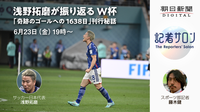 カタールW杯のドイツ戦で、劇的な決勝ゴールを挙げた浅野拓磨選手が舞台裏を語り尽くした書籍『浅野拓磨 奇跡のゴールへの1638日』が、6月7日に発売されました。できることをすべてやり尽くしたからこそ、かなえられた夢。逆境に置かれても自分を信じ、決してあきらめることのなかった軌跡をたどった感動の物語です。2018年ロシアW杯での代表落選、世間から忘れかけられたセルビア移籍、夜逃げ同然の契約解除、念願の大会直前に負った大ケガ……。次々と降りかかる困難に立ち向かい、W杯で挙げるゴール(3秒のワンプレー)のためにすべてを捧げた4年半の力戦奮闘を本人の言葉で振り返ります。浅野選手とサッカー担当記者が語り合うオンラインイベント「浅野拓磨が振り返る W杯『奇跡のゴールへの1638日』刊行秘話」が、6月23日(金)から朝日新聞デジタルで配信されます。