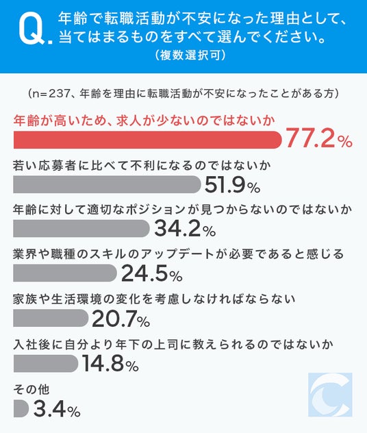 もっとも多かったのは「年齢が高いため、求人が少ないのではないか」で、77.2%と8割近くの方が回答していました。