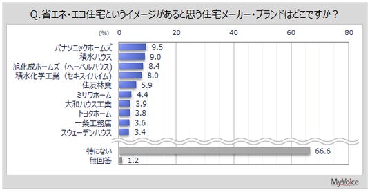 ■『省エネ・エコ住宅』のイメージがある住宅メーカー、「特にない」が7割弱と高い。上位は「パナソニックホームズ」「積水ハウス」で各9%台