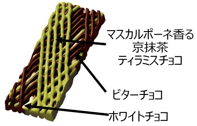 京都産の宇治抹茶とマスカルポーネチーズを合わせた抹茶ティラミスチョコに、ビターチョコ、ホワイトチョコが折り重なった上質な味わいです。