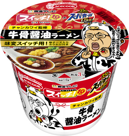 コラボ企画第5弾となる今回は、視聴者と一緒に商品パッケージを考案。チャンカワイさんが番組収録参加者に商品をプレゼンし、その場でアイデアを募り完成させました。チャンさんこだわりの、ビーフをベースに、ガーリックやジンジャーを利かせた牛骨醤油スープを採用し、地元民が好む味わいを再現しました。さらに「スイッチ!」10周年を記念して、後掛け「味変スイッチ用!粉チーズ入りふりかけ」で二度楽しめます。視聴者考案キャッチコピーを組み合わせた「たまりしょうゆと牛骨のうまみ!味変で二度惚れてまうやろ!」を再現した最強の一杯です。