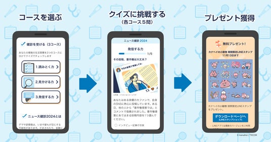 キャンペーン期間中に本コンテンツの各コースを完了したユーザーには、特典としてコース毎に朝日新聞デジタルの期間限定無料お試し体験、「Yahoo!ニュース」のコメント欄プロフィールに使用できるアイコン、「ニュース健診2024」をイメージした「カナヘイの小動物」オリジナルLINEスタンプを、それぞれプレゼントします。