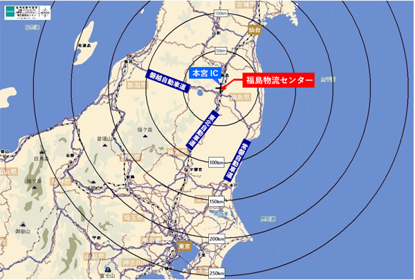 本センターは、東北自動車道「本宮インターチェンジ」から約5.2kmとアクセスに優れ、東北自動車道と磐越自動車道が交わる「郡山ジャンクション」にも約8kmと近接することから、物流拠点として好立地にあります。「本宮インターチェンジ」から宮城県仙台市まで約110km、東京都新宿区まで約250kmの距離に位置するため、東北エリアと首都圏を結ぶ長距離輸送の中継拠点としての活用にも優れています(※3)。