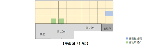 搬送設備:貨物用エレベーター2基(3.6t:1基、4.6t:1基)、垂直搬送機1基(1.5t)