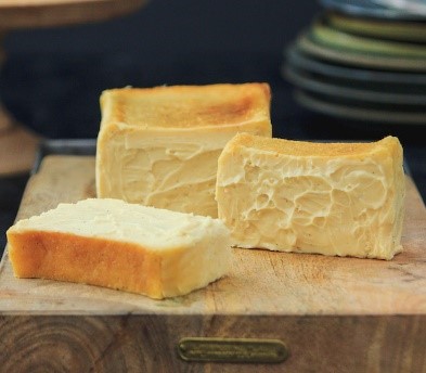 北海道産のチーズを2種ブレンドし、たっぷりのサワークリームと発酵バターで濃厚ながら後を引く心地よい酸味のチーズケーキ。繊細な湯煎焼きでとろ生食感に仕上げました。自家製焦がしキャラメルとバニラが香ります。