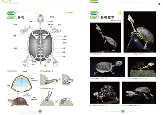 ・カメという生き物【・カメはどういう生き物か・分類・自然下での生息環境・カメの体:骨格/骨格標本頭部/頚部/眼/鼻/耳口/舌/四肢/尾/皮膚と鱗/甲羅/消化器/体腔内蔵器/呼吸器/循環器/泌尿器/生殖器】・生態・特徴的なカメ