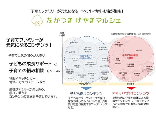 当日は、高槻市の後援のもと、地元高槻を中心とした70以上の企業や学校、団体の皆さまと共に親子で楽しめるワークショップやマルシェの他、育児のお困りごとの解決に繋がる情報発信や地域の子育て施設や団体の活動紹介など子育て世代にとって有益な情報提供を行えればと思っています。
