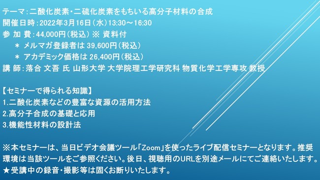 先端技術情報や市場情報を提供している(株)シーエムシー・リサーチ(千代田区神田錦町: https://cmcre.com/ )では、 各種材料・化学品などの市場動向・技術動向のセミナーや書籍発行を行っておりますが、 このたび「二酸化炭素・二硫化炭素をもちいる高分子材料の合成」と題するセミナーを、 講師に落合 文吾 氏 山形大学 大学院理工学研究科 物質化学工学専攻 教授)をお迎えし、2022年3月16日(水)13:30より、 ZOOMを利用したライブ配信で開催いたします。 受講料は、 一般:44,000円(税込)、 弊社メルマガ会員:39,600円(税込)、 アカデミック価格は26,400円(税込)となっております(資料付)。