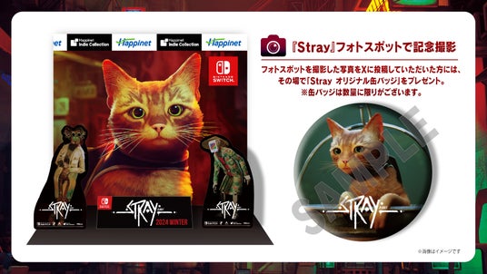 フォトスポットで撮影した写真をXに投稿していただいた方には、その場で「Stray オリジナル缶バッジ」をプレゼント。BitSummitご来場の際は、記念写真を撮影しにHappinet Indie Collectionブースへぜひお越しください!